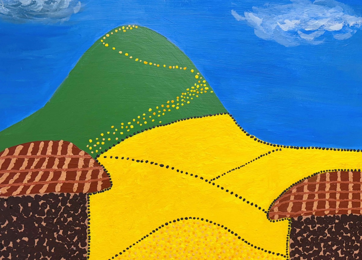 노란색 들판이 그림의 하단과 중앙을 가로지르며 펼쳐져 있습니다. 들판은 점선으로 구획이 나뉘어 있고, 일부는 노란색 점들로 채워져 있습니다. 들판 뒤로는 초록색의 둥근 산이 있고, 산에도 노란색 점선이 길게 이어져 있습니다. 그림의 양쪽 하단에는 갈색 지붕을 가진 초가집 두 채가 대칭을 이루고 있으며, 푸른 하늘 위로는 흰색 구름이 떠 있습니다.