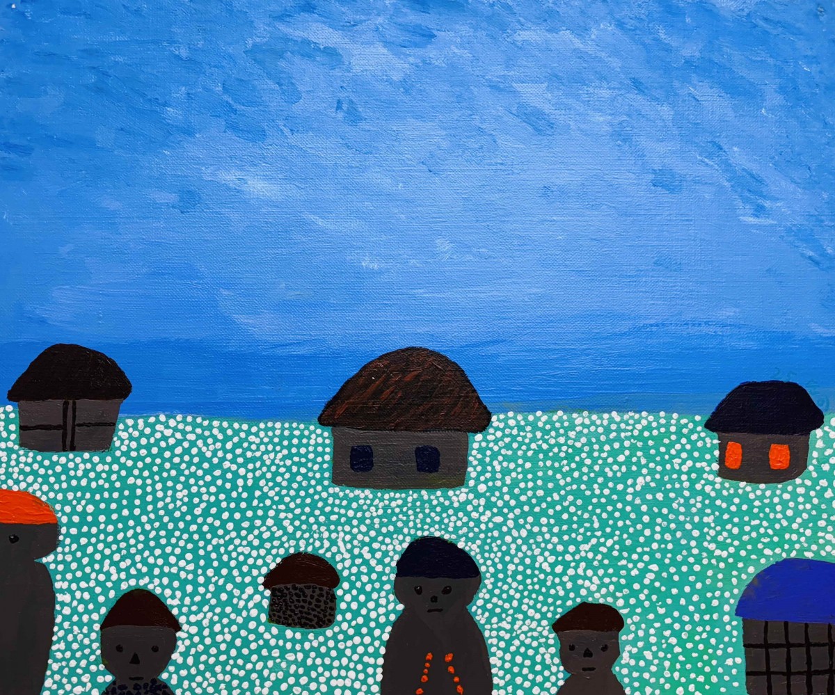 초록색의 넓은 들판을 하얀 점들이 가득 채우고 있습니다. 들판 위에는 갈색 지붕을 얹은 회색 집들이 여러 채 서 있고, 크기가 각기 다르게 표현되었습니다. 들판에는 둥근 얼굴에 검은색 모자를 쓴 사람들의 모습이 보입니다. 하늘은 짙은 푸른색과 옅은 하늘색이 섞여 있고, 짧고 거친 붓 터치가 남아 있습니다.