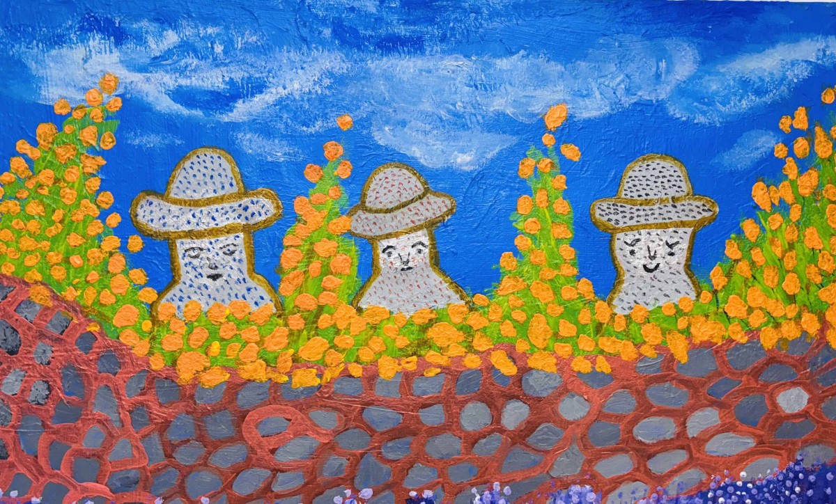 넓은 하늘 아래, 세 개의 돌하르방이 서 있습니다. 회색 돌하르방의 얼굴에는 눈, 코, 입이 그려져 있고, 서로 다른 표정을 취합니다. 돌하르방 뒤로는 노란색과 연두색의 꽃과 풀들이 무성하게 솟아 있습니다. 그림의 아래쪽에는 육각형 무늬가 새겨진 짙은 갈색 담장이 있고, 그 아래에는 보라색 풀들이 빽빽하게 자라 있습니다.