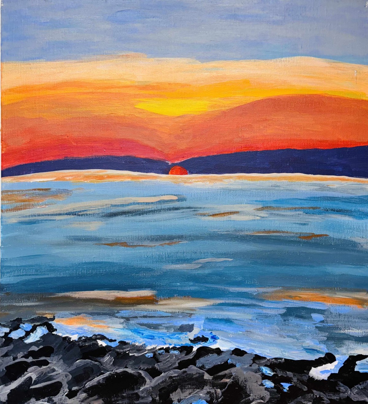 수평선 너머로 붉은 해가 지고 있습니다. 해가 진 하늘은 주황색과 붉은색, 옅은 보라색 구름들로 물들어 있습니다. 해 아래로는 파란색과 회색이 섞인 바다가 넓게 펼쳐져 있으며, 물감의 거친 붓 터치가 물결의 움직임을 표현합니다. 그림의 가장 아래쪽에는 짙은 회색의 울퉁불퉁한 바위들이 가득합니다.