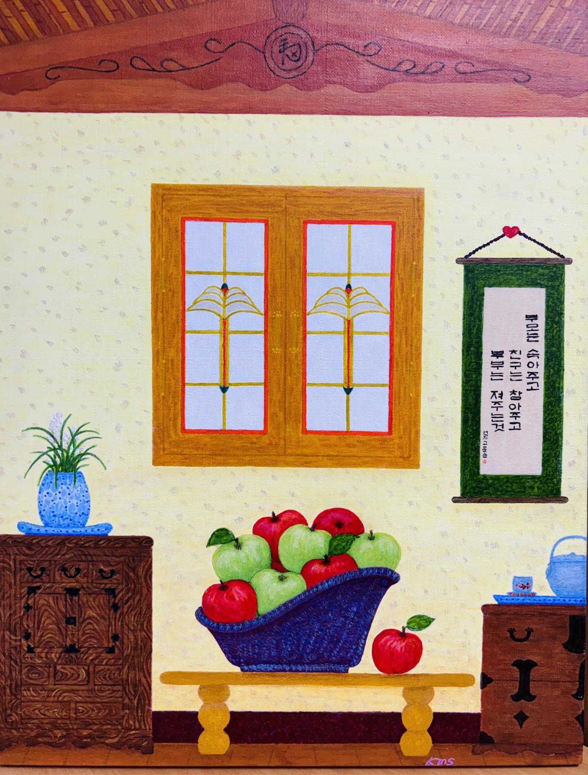 방 한가운데에는 짙은 보라색 바구니에 빨간색과 연두색 사과가 가득 담겨 있습니다. 바구니 아래에는 옅은 갈색의 긴 의자가 받치고 있습니다. 방 왼쪽에는 짙은 갈색의 전통 가구 위 푸른색 화분에 하얀 꽃이 피어 있고, 오른쪽에는 또 다른 갈색 전통 가구 위에 청색 꽃병이 놓여 있습니다. 방의 중앙에는 나무 창문이 있고, 창문 오른쪽에는 ‘부모는 속아주고 친구는 참아주고 부부는 져주는 것’이라 쓰인 족자가 걸려 있습니다.