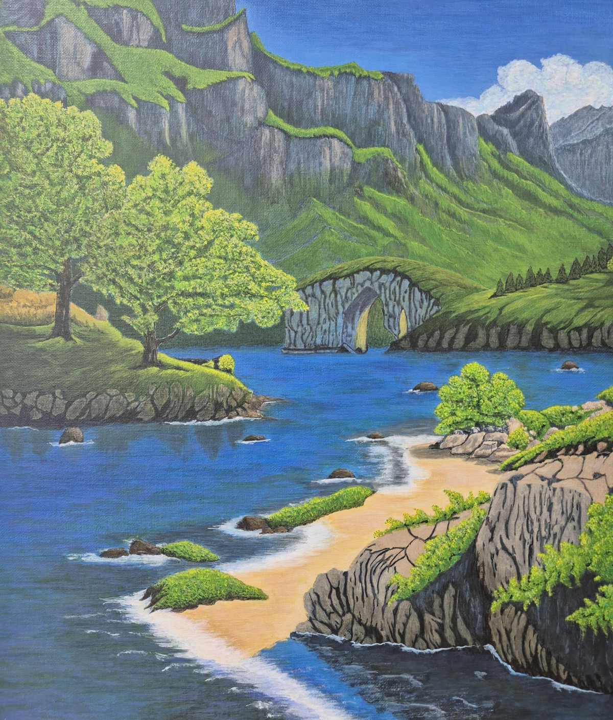 파란색 물이 흐르는 강가를 묘사한 그림입니다. 그림의 양옆으로는 짙은 녹색의 가파른 산들이 서 있습니다. 산과 강이 만나는 부분에는 노란 모래사장과 뾰족한 바위들이 드러나 있으며, 바위 위에는 푸른 이끼와 나무들이 자라고 있습니다. 강 건너편에는 커다란 바위로 만들어진 아치형 다리가 보입니다.