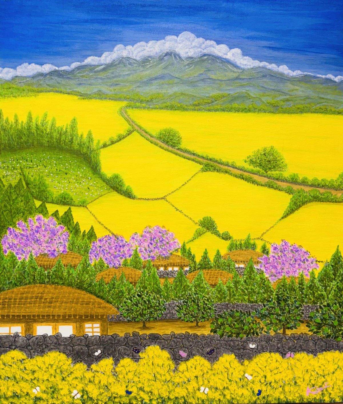 노란색 들판과 그 위로 뻗은 길이 그림의 중앙을 가로지릅니다. 들판 뒤로는 초록색 산맥이 보이고, 산 정상에는 하얀 구름이 덮여 있습니다. 그림의 아래쪽에는 돌담이 길게 이어져 있고, 그 뒤로 제주 전통 가옥들이 보입니다. 가옥 주변에는 짙은 초록색 나무와 분홍색 꽃이 핀 나무들이 조화를 이루고 있습니다.