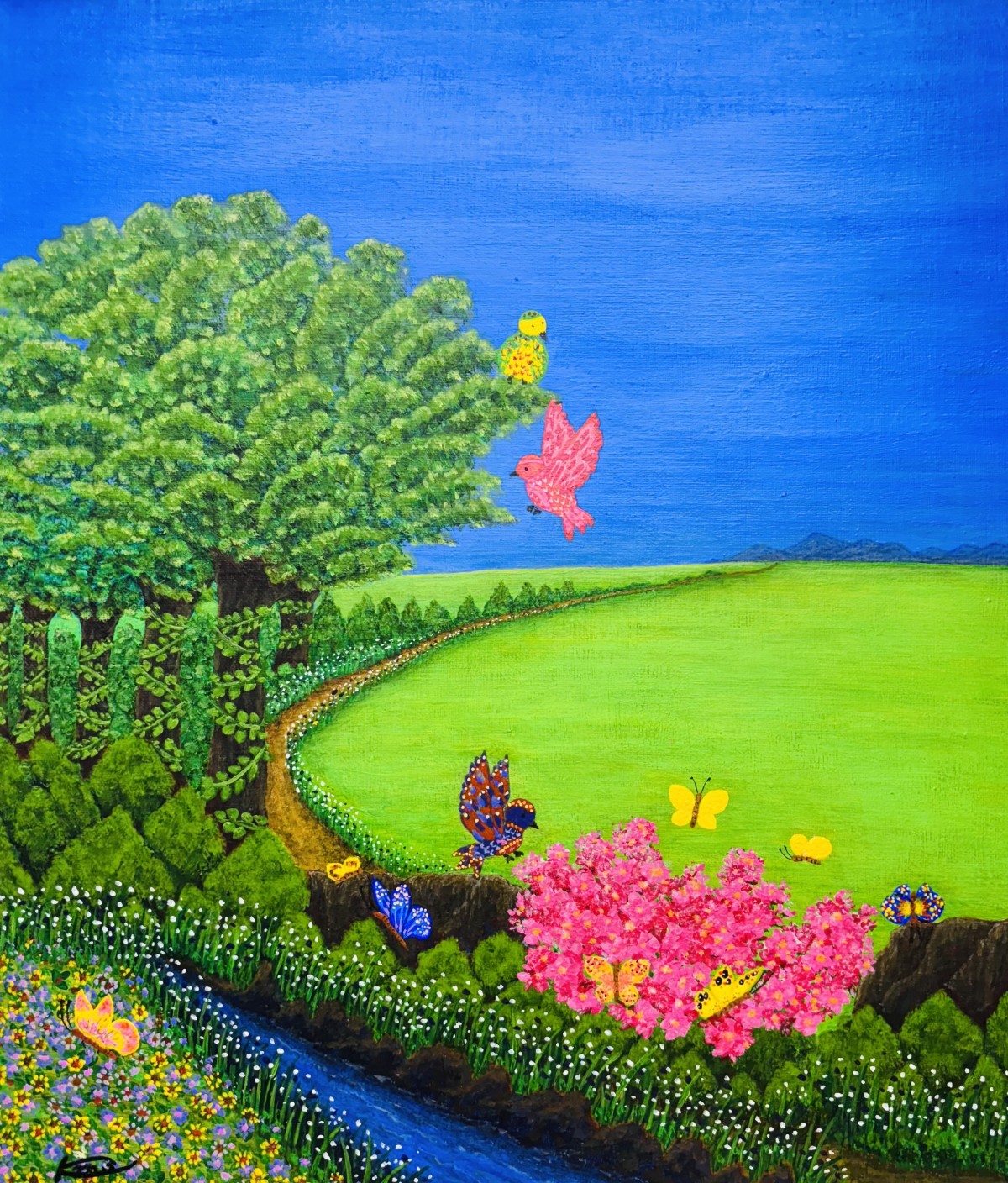 진한 파란색 하늘 아래, 연두색 들판이 넓게 펼쳐져 있습니다. 들판 옆에는 작은 개울이 흐르고 있고, 개울을 따라 좁은 흙길이 구불구불 이어져 있습니다. 길 주변에는 키가 큰 초록색 나무와 함께 분홍색 꽃이 핀 나무가 있습니다. 그림 속에는 분홍 새와 여러색을 가진 새가 날아다니고, 파란색, 노란색, 보라색 등 여러 색의 나비들이 곳곳에 자리하고 있습니다.