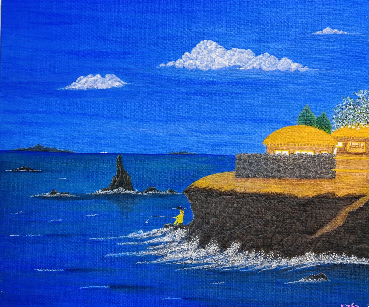 하얀 파도가 부서지는 바위 절벽 위로 초가집이 두 채 서 있습니다. 절벽 위에는 돌담이 쌓여 있고, 그 뒤로 갈색 지붕의 집들과 푸른 나무들이 보입니다. 그림 왼쪽에는 뾰족한 바위섬이 바다에 솟아 있고, 그 뒤로는 수평선 너머로 섬들이 희미하게 보입니다. 절벽 아래 노란색 옷을 입은 사람 한 명이 낚싯대를 드리우고 있습니다.