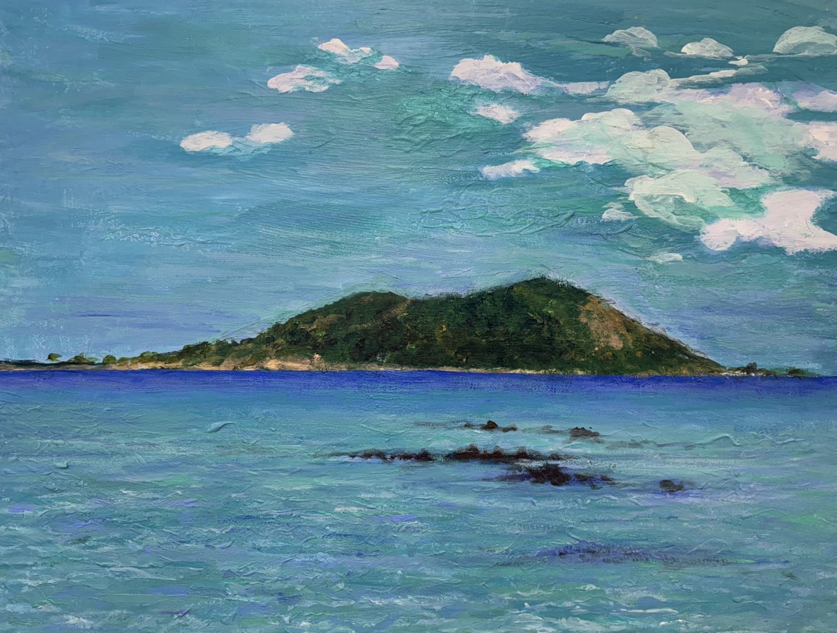진한 파란색과 옅은 하늘색이 섞인 하늘 아래, 수평선 너머로 짙은 초록색 섬이 길게 뻗어 있습니다. 바다는 푸른빛과 옅은 초록빛을 띠고 있으며, 파도 위에는 검은 바위들이 드러나 있습니다. 그림의 하늘과 바다에는 물감의 붓 터치가 거칠게 남아 있어 질감이 느껴집니다.