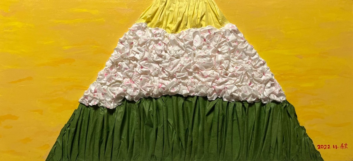 한지의 독특한 질감을 활용하여 산의 모습을 표현한 그림입니다. 그림 가운데 있는 산은 한지를 이용하여 노란색 봉우리, 하얀색 산 중턱, 초록색 산 아래를 표현했습니다. 한지를 구겨서 붙인 듯한 질감 표현이 돋보입니다. 배경은 노란색 아크릴 물감을 사용하여 한지 특유의 질감과 아크릴 물감의 조화가 흥미롭게 느껴집니다.