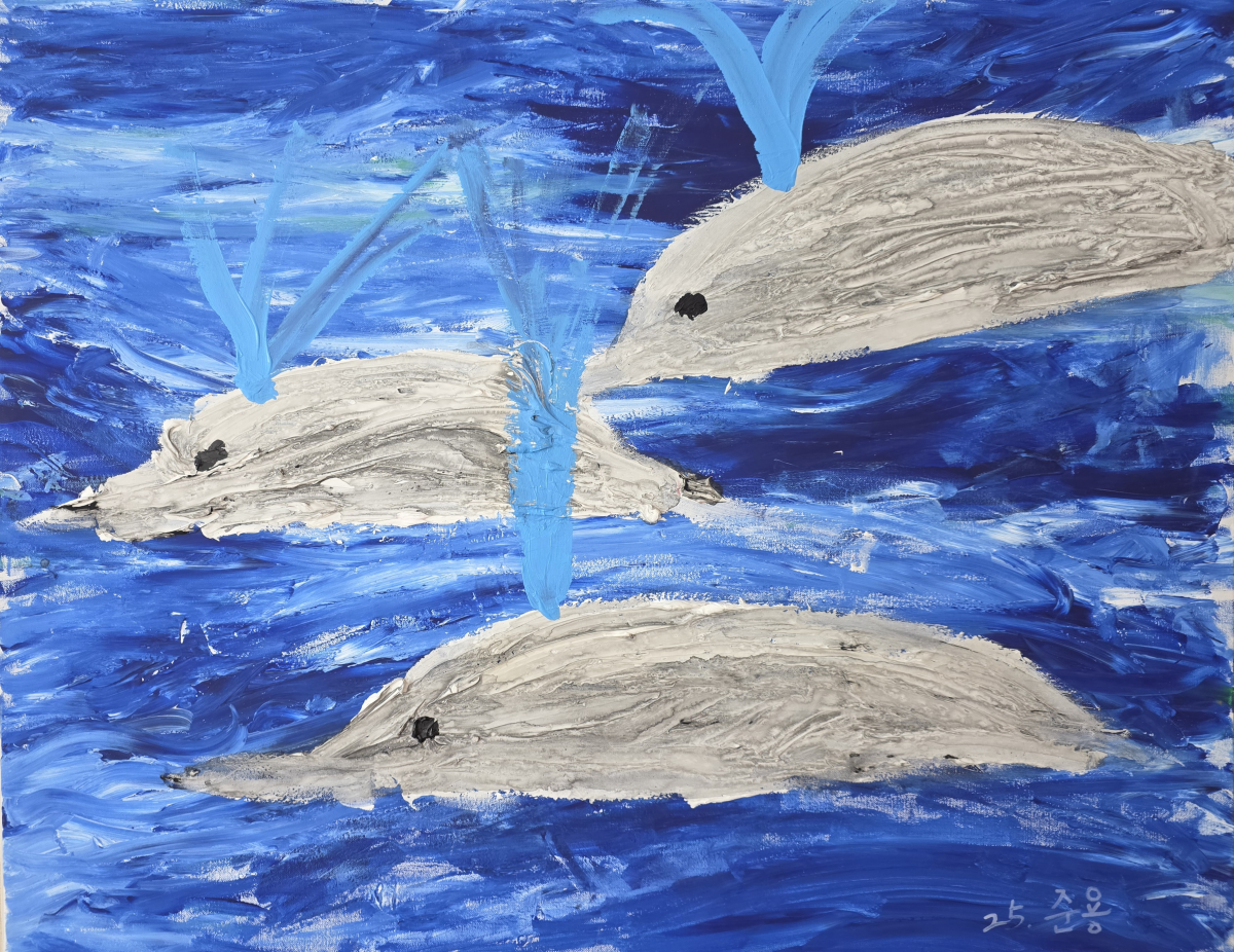 돌고래들의 머리 위로는 옅은 파란색 물줄기가 여러 갈래로 솟아오릅니다.