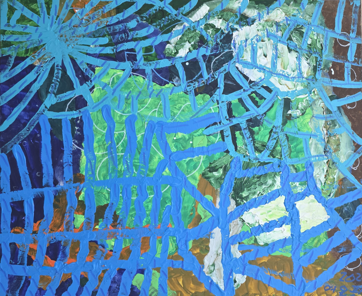 짙은 파란색, 초록색, 갈색 물감이 두껍게 겹쳐진 배경 위를 밝은 하늘색의 그물망이 덮고 있습니다.