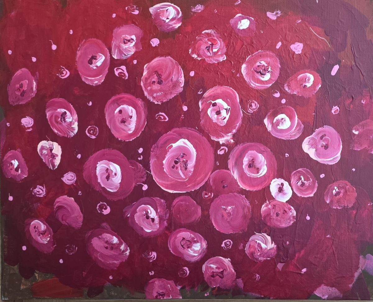 이 붉은 배경 위로 분홍색과 흰색 물감을 겹쳐 칠한 둥근 무늬들이 화면을 가득 채우고 있습니다.